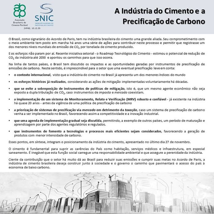 A ideia do posicionamento da indústria nacional é partir do Roadmap Brasil, lançado em 2019 e que apontava meios para reduzir a emissão de CO2 na produção de cimento, e ampliar para o ciclo de vida do produto, incorporando o concreto, a construção, a eletrificação, entre tantas outras ramificações que permitam alcançar a neutralidade climática do setor até 2050.